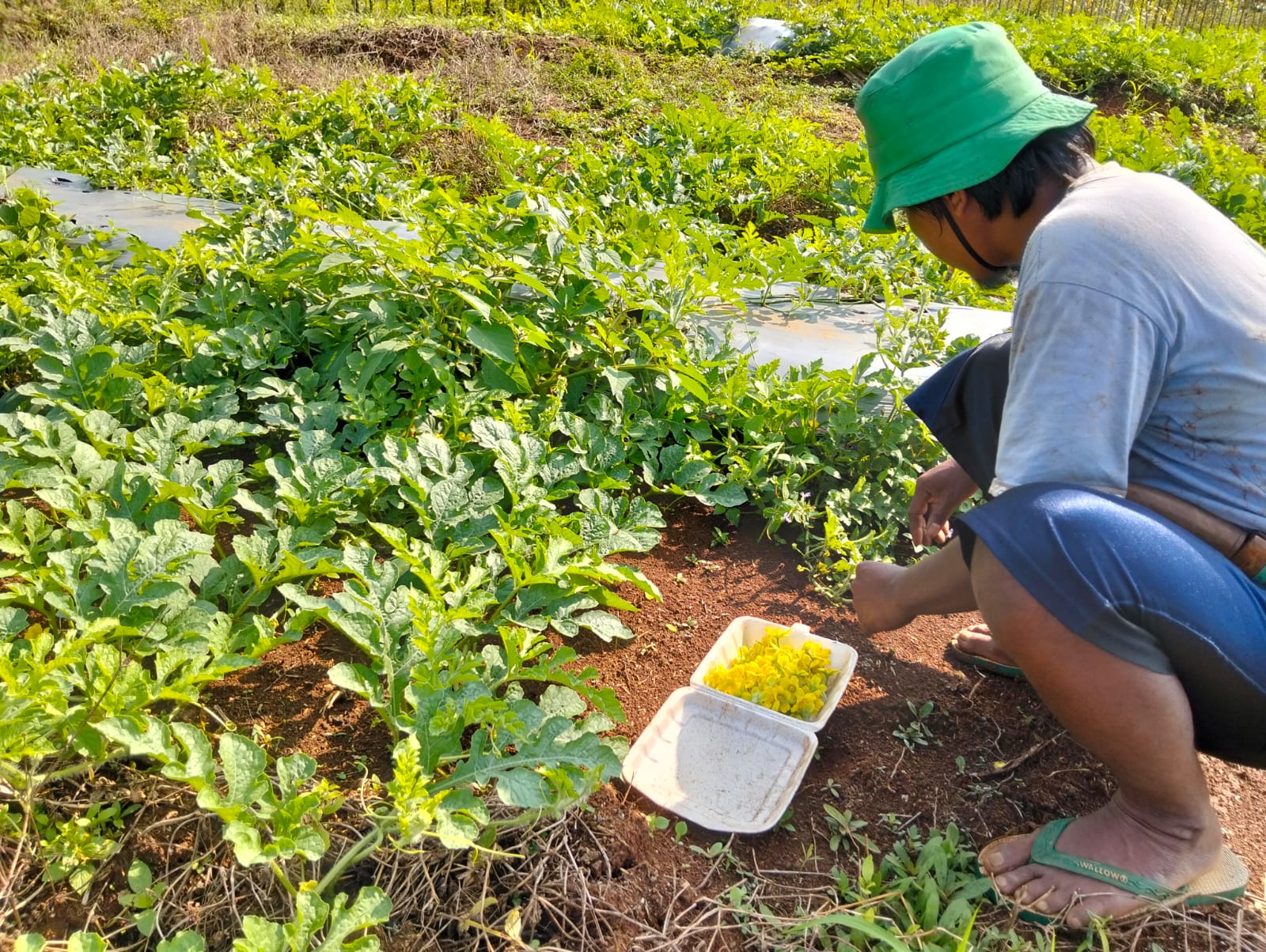 Saat dikunjungi oleh Fasilitator Lokadesa, Anang tampak memantau perkembangan bunga-bunga semangkanya. Di usia tanam baru sekitar lima pekan, sudah mulai terlihat beberapa buah semangka dengan berat mencapai satu kilogram. Ia juga terlihat melakukan penjarangan buah, membuang beberapa bakal semangka agar hasil panen lebih optimal.