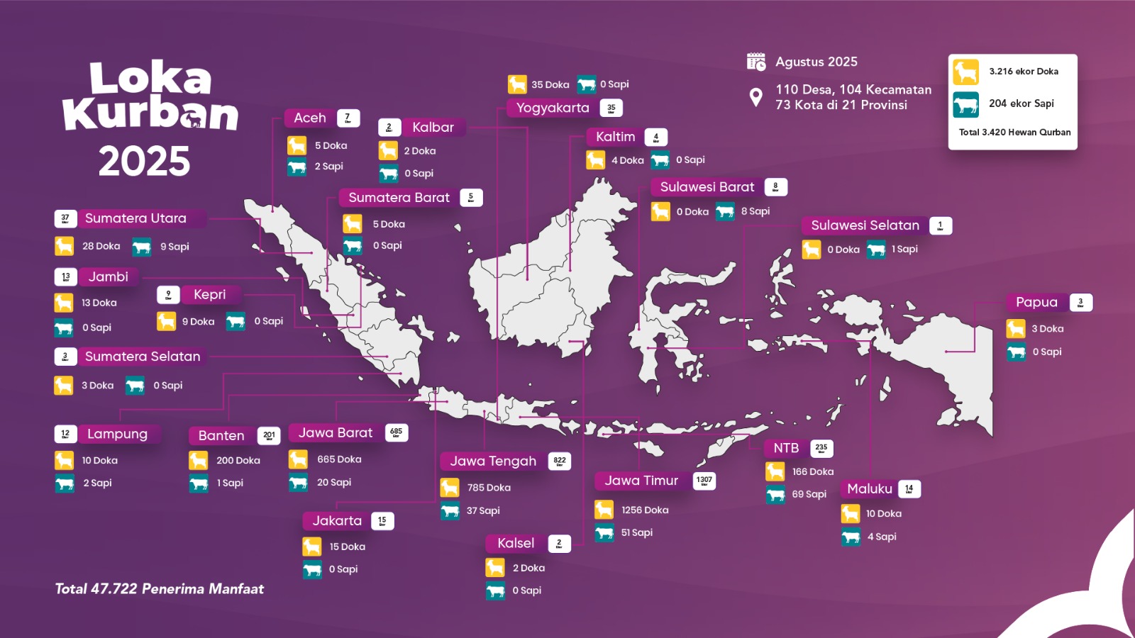 Distribusi dilakukan dari Sumatera hingga Papua, menyasar daerah dengan keterbatasan akses terhadap daging kurban. Melalui upaya ini, sebanyak 47.722 penerima manfaat telah merasakan dampaknya secara langsung.